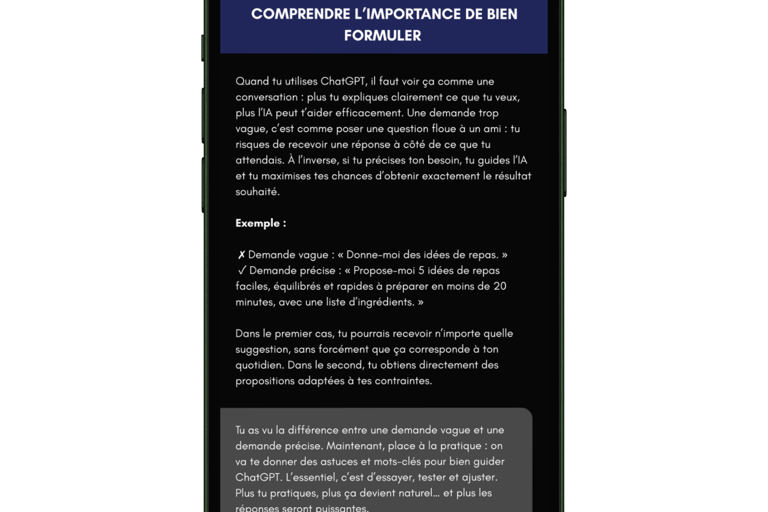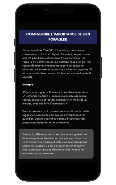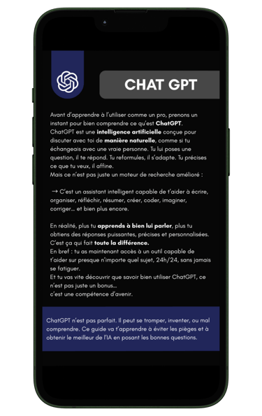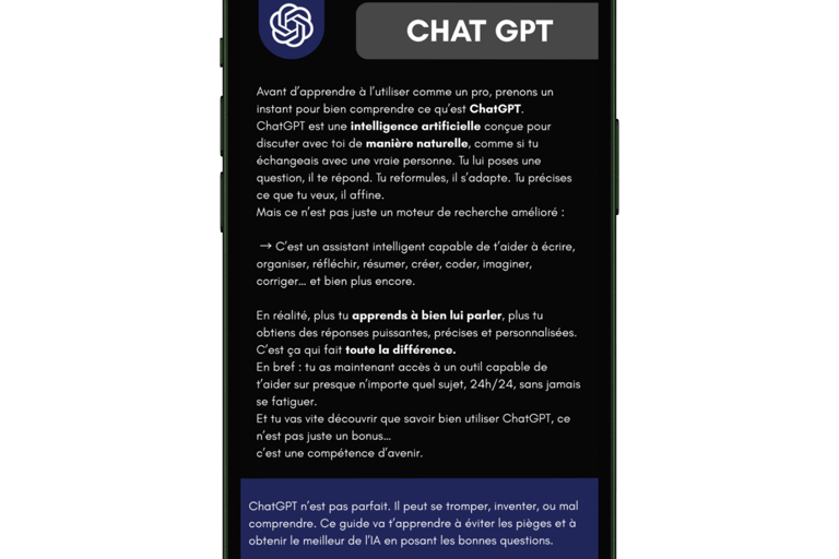 Ici, on t’accompagne pas à pas pour maîtriser ChatGPT et en tirer le meilleur dans ta vie perso et pro.